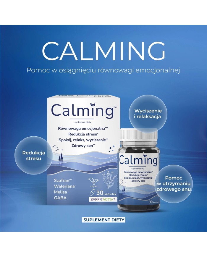 Calming to suplement diety stworzony dla osób żyjących w napięciu, narażonych na stres i przeciążenie psychiczne, które chcą naturalnie wspierać równowagę emocjonalną oraz jakość snu. Połączenie klinicznie przebadanego ekstraktu z szafranu SAFFR’ACTIV®, GABA oraz ekstraktów roślinnych pomaga utrzymać pozytywny nastrój, wspiera relaksację i regenerację organizmu. Regularne stosowanie może wspomagać odprężenie po intensywnym dniu, poprawiać komfort psychiczny i sprzyjać zdrowemu rytmowi snu. To kompleksowe wsparcie dla układu nerwowego w codziennym funkcjonowaniu.