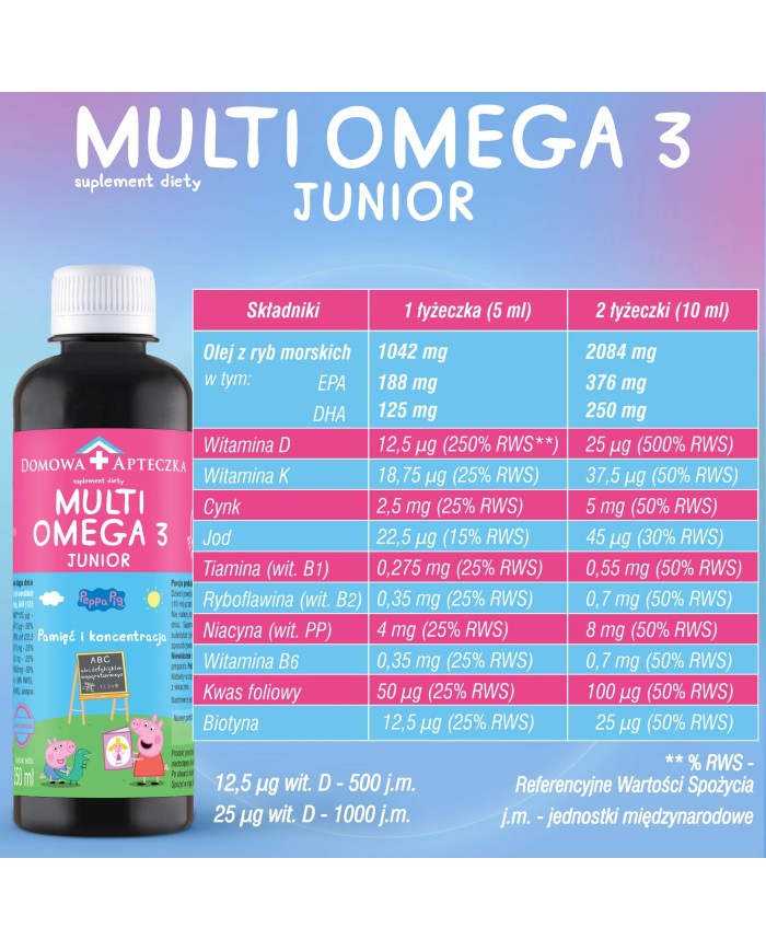 MultiOmega 3 Junior to suplement stworzony z naciskiem na skuteczność, komfort stosowania i bezpieczeństwo dzieci. Innowacyjna technologia emulsji zwiększa przyswajalność składników, a brak rybiego zapachu sprawia, że dzieci chętnie go przyjmują. To połączenie jakości farmaceutycznej z formą przyjazną dla najmłodszych.
