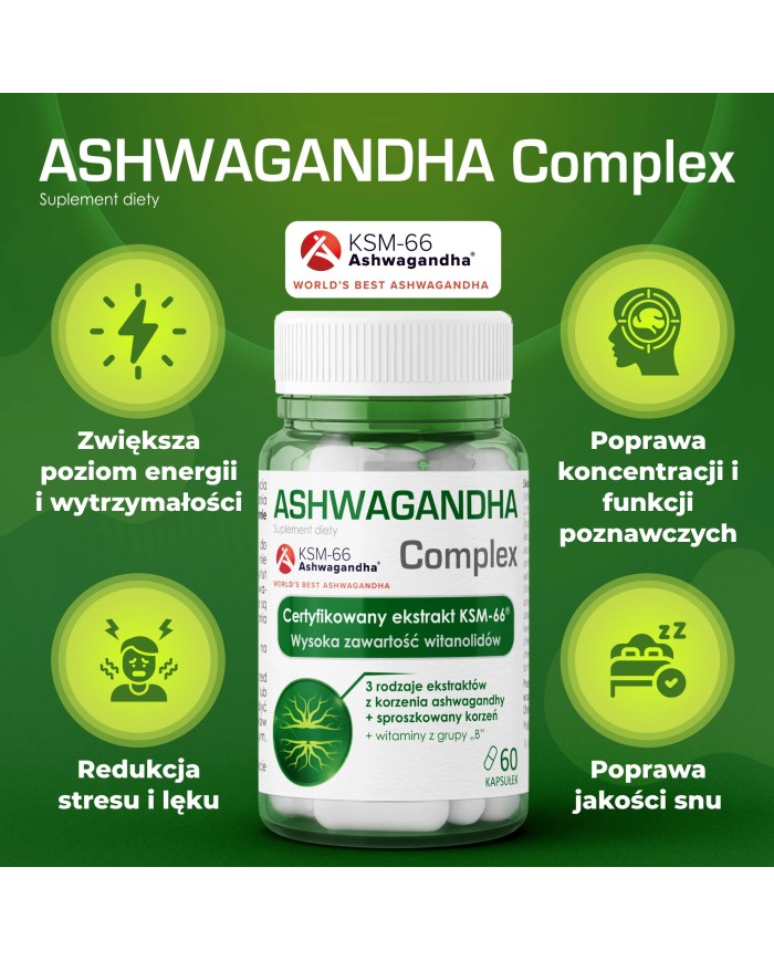 Żyjesz w ciągłym biegu, a stres zaczyna odbijać się na Twoim zdrowiu i nastroju? Ashwagandha Complex to suplement diety w formie 60 kapsułek. Dzięki unikalnemu połączeniu aż trzech rodzajów ekstraktów z witianii ospałej – w tym przebadanego klinicznie ekstraktu KSM-66® – produkt ten skutecznie pomaga odzyskać wewnętrzny spokój. To idealne rozwiązanie dla osób pracujących umysłowo, sportowców oraz każdego, kto pragnie naturalnie wzmocnić swoją odporność psychiczną i fizyczną.