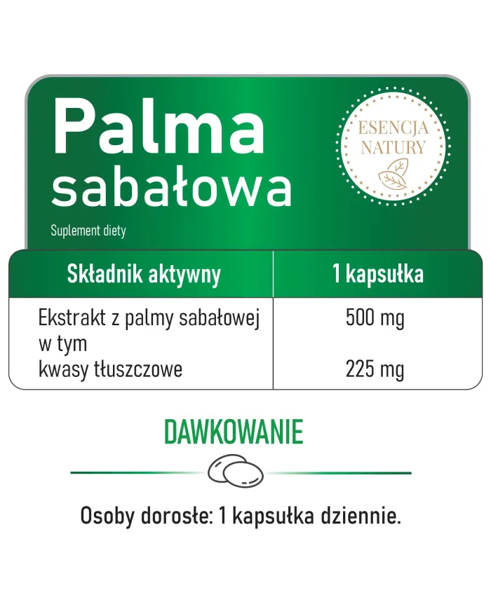 - czysta formuła — tylko ekstrakt z palmy sabałowej i otoczka kapsułki. Bez zbędnych wypełniaczy, barwników i konserwantów