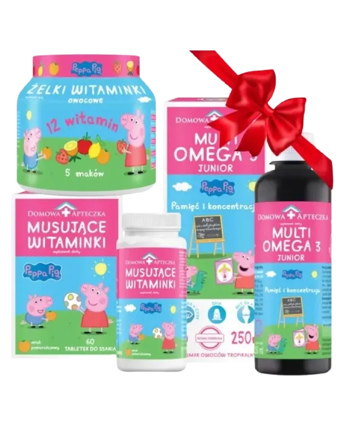 Zestaw prezentowy dla dzieci to wyjątkowe połączenie smaku i troski o zdrowie najmłodszych. W jego skład wchodzą starannie dobrane suplementy inspirowane ulubioną bohaterką – Peppą, które wspierają codzienną odporność, rozwój oraz energię dziecka. Owocowe żelki, musujące witaminki oraz płynna formuła Omega-3 o tropikalnym smaku sprawiają, że suplementacja staje się przyjemnością, a nie obowiązkiem. To idealny pomysł na prezent, który łączy radość z dbaniem o prawidłowy rozwój i dobre samopoczucie dziecka każdego dnia.